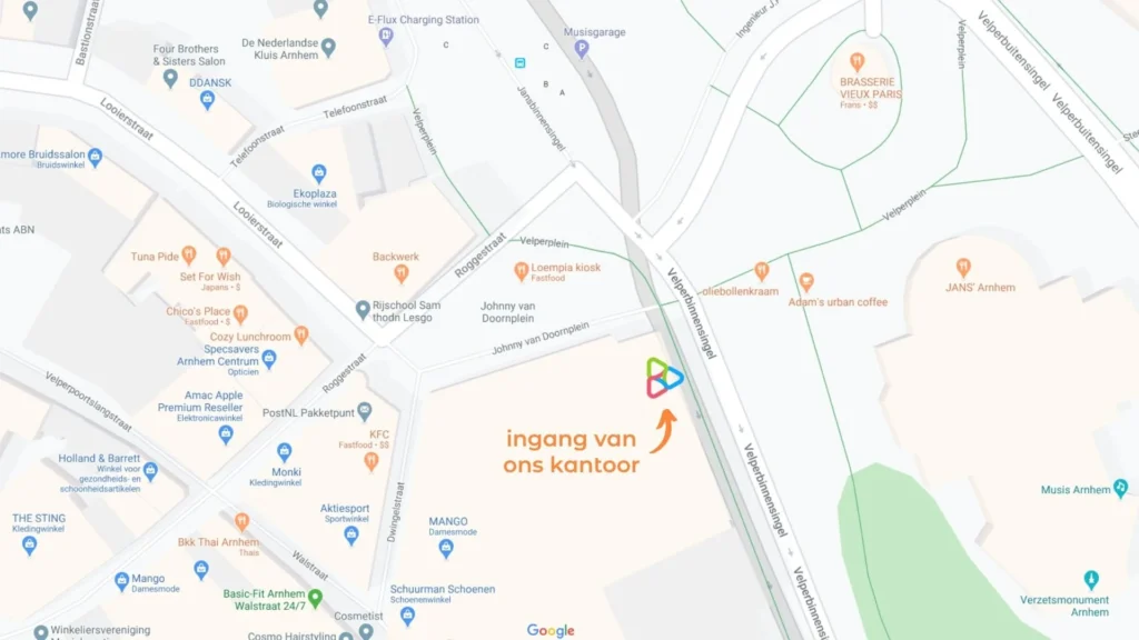 De ingang van Journey Offices & Spaces bevindt zich aan de zijkant van het pand: loop de Roggestraat uit richting de bushalte (maar steek niet over), ga rechtsaf de Velperbinnensingel op. De ingang zit gelijk aan de rechterzijde van de straat.